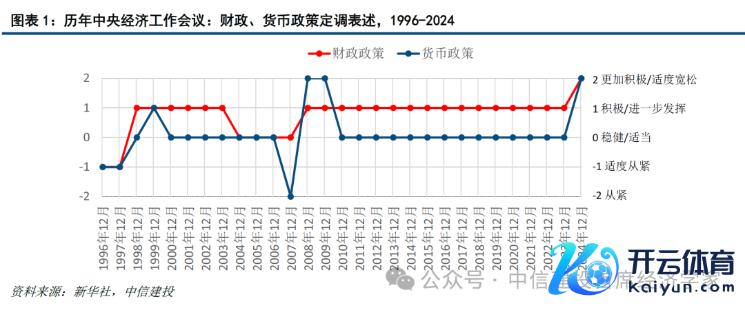 “愈加积极、限制宽松”的定调表述,是我国历次中央经济使命会议中,对财政、货币政策表述多年来最积极有劲的措辞水平,如图表1: