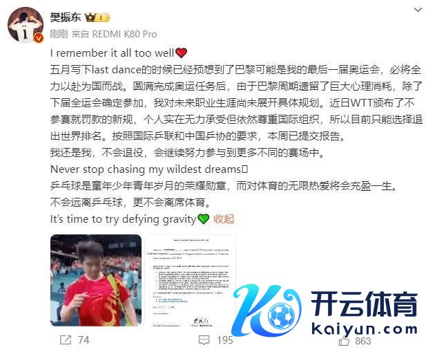 12 月 27 日,樊振东发文,称将退出宇宙排行,但不会退役。